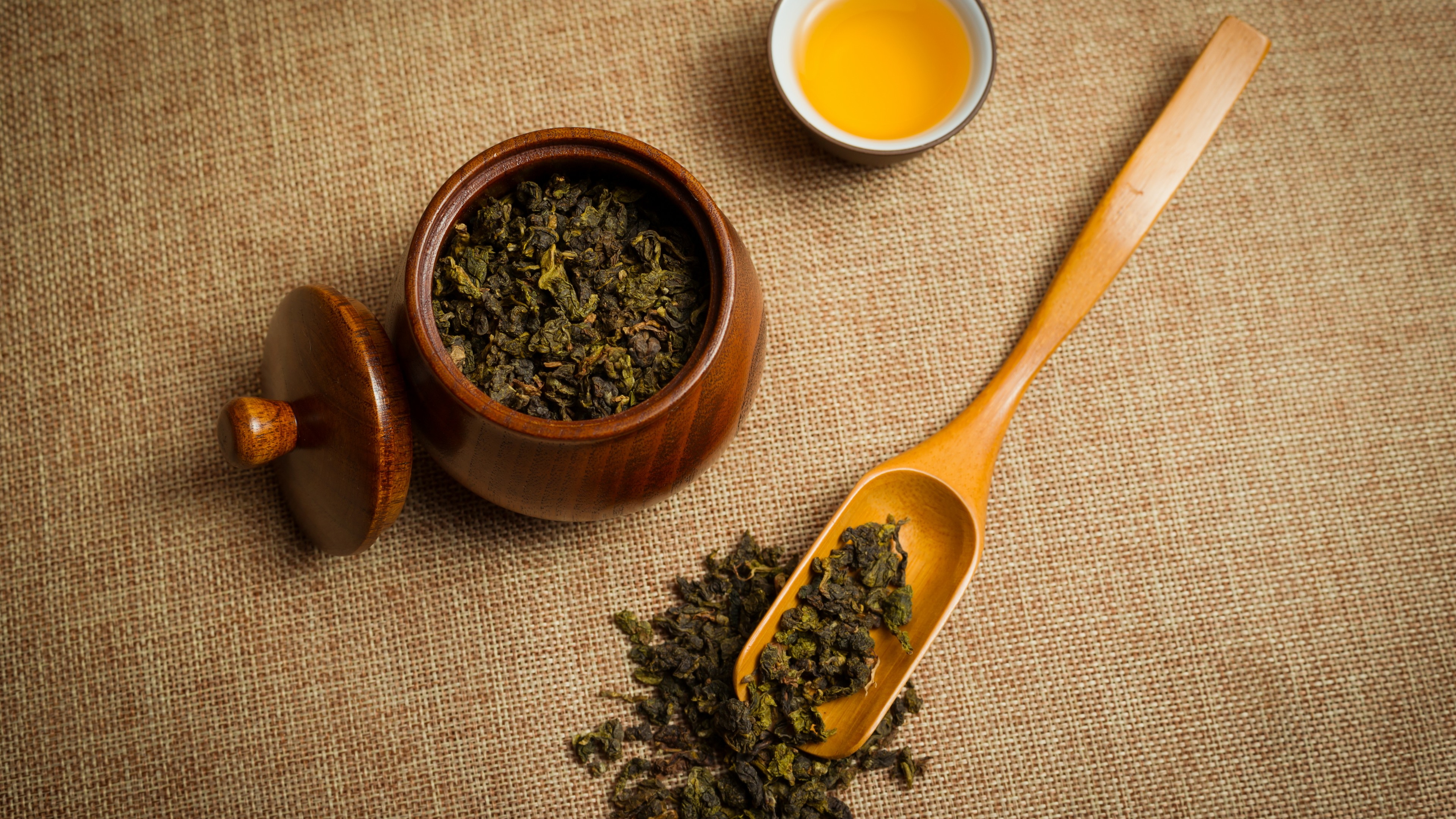 Description: A wooden spoon with a tea in it next to a cup of tea and a spoon with a teabag.