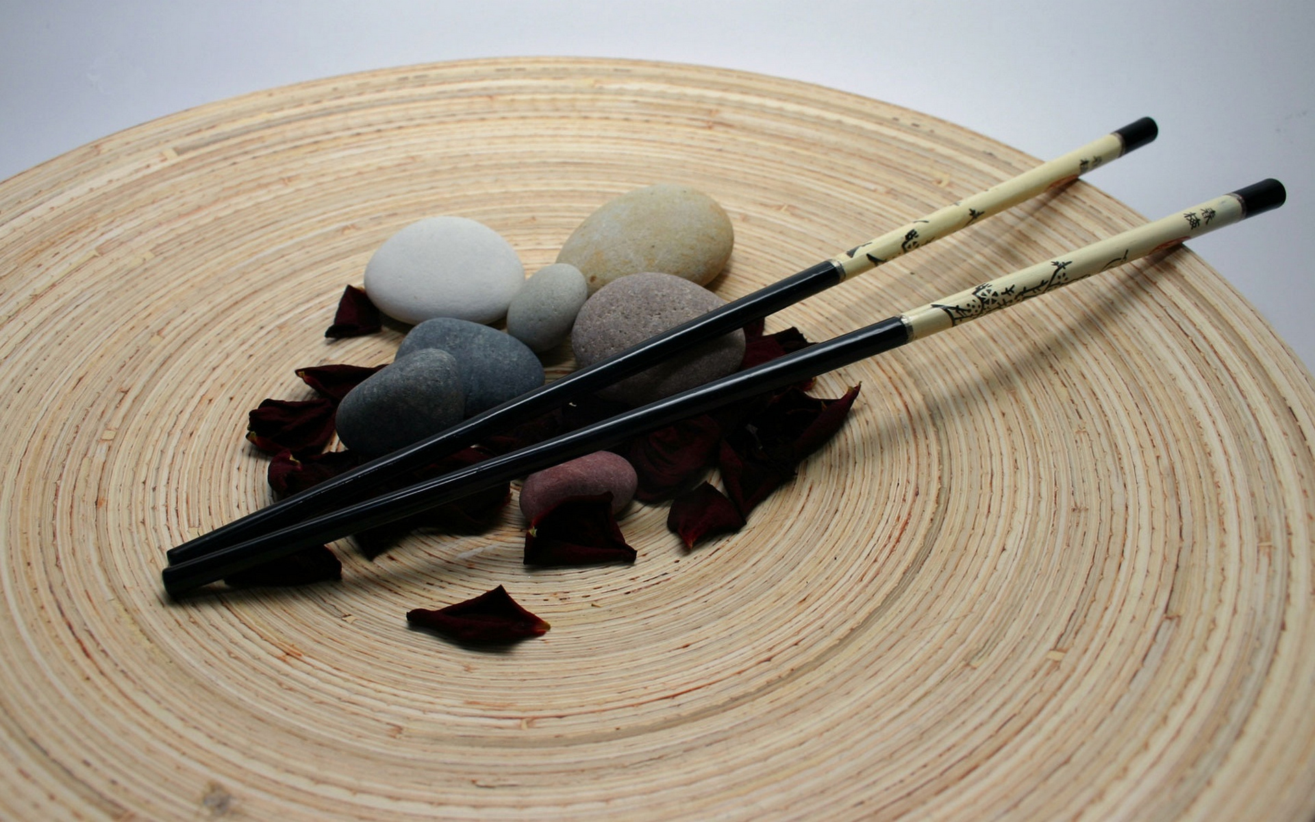 Description: A couple of wooden sticks sitting on top of a wooden plate with rocks and leaves on it and a couple of rocks on top of the same stick.