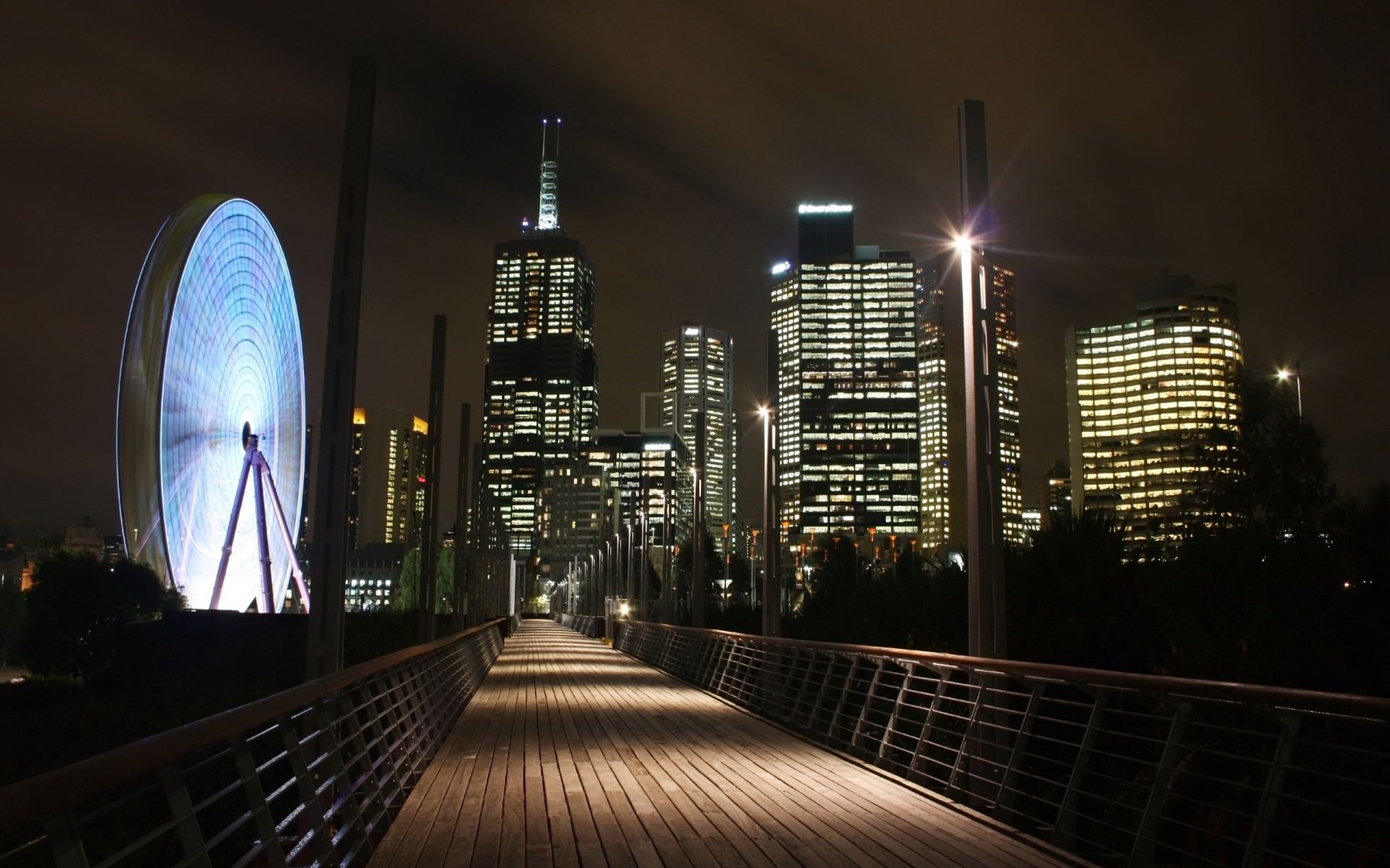 Description: A wooden walkway with a ferris wheel in the background at night time with lights on the buildings and a dark sky.