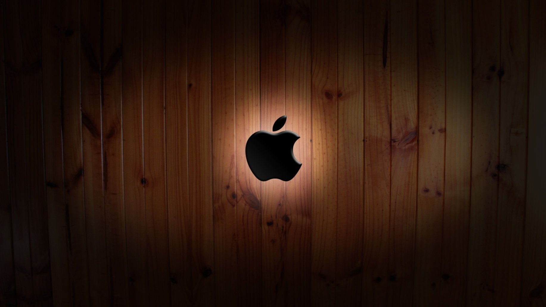 Description: A wooden wall with a apple logo on it and a light shining on it's side of the wall.