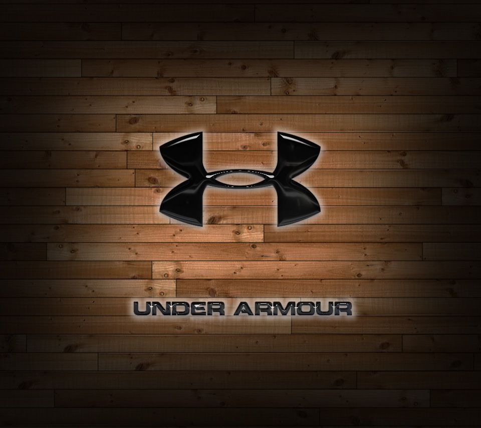 Description: A wooden wall with a logo on it and the words under armour on it in black and white letters.