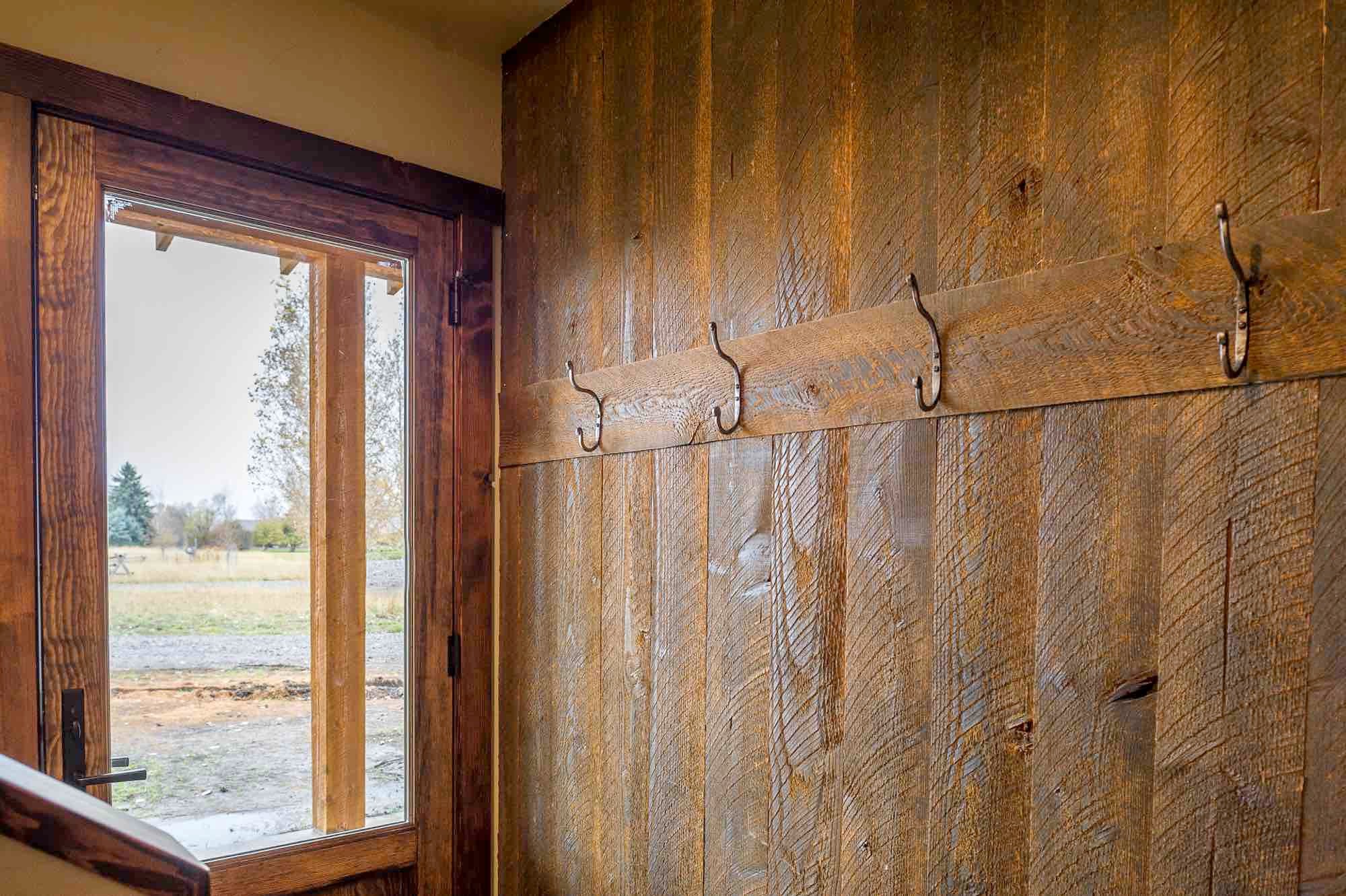 Description: A wooden wall with a window and a wooden rail in it and a wooden door with a window frame.