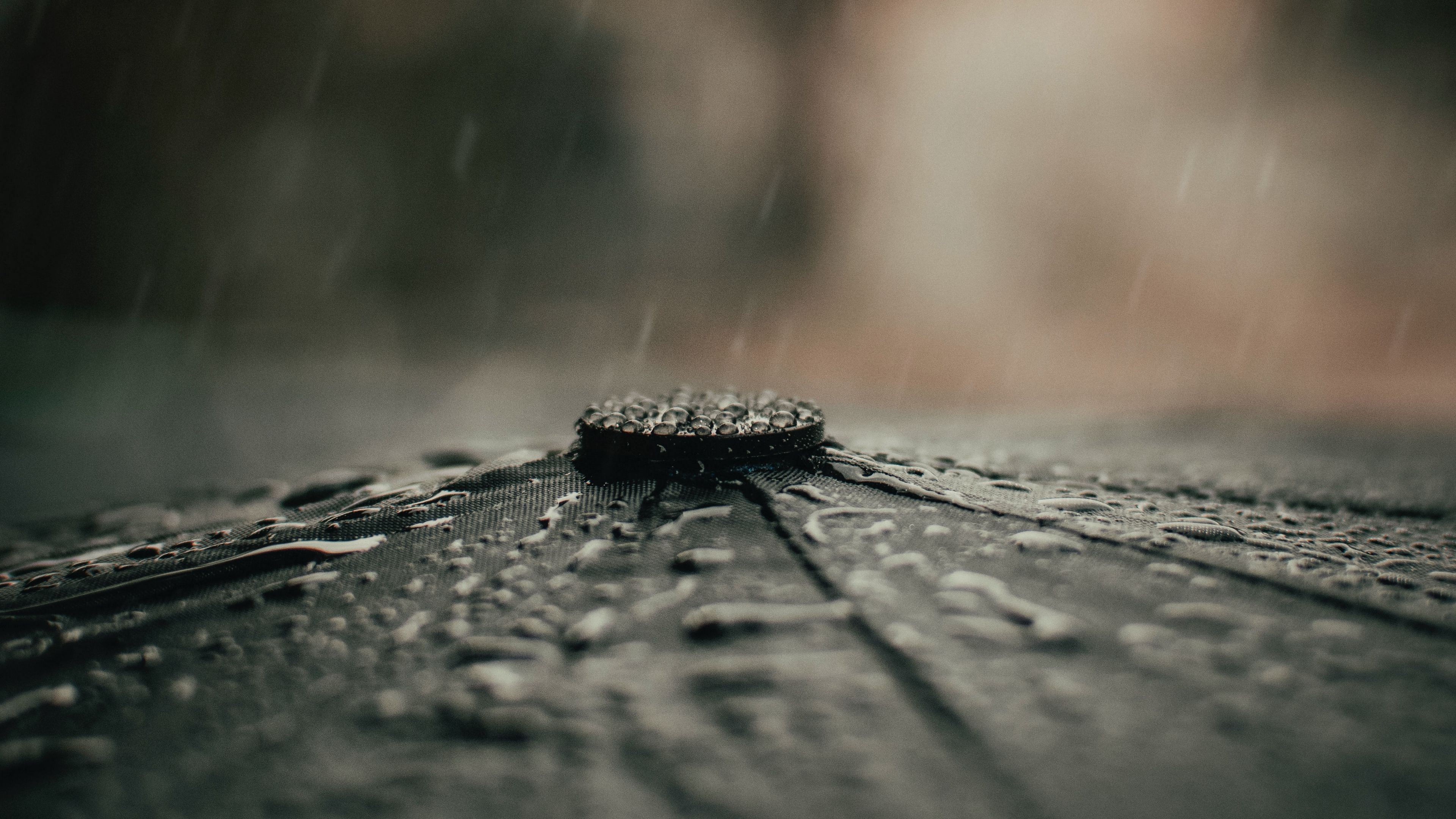 Description: A close up of a wooden surface with water droplets on it and a blurry background of a building.