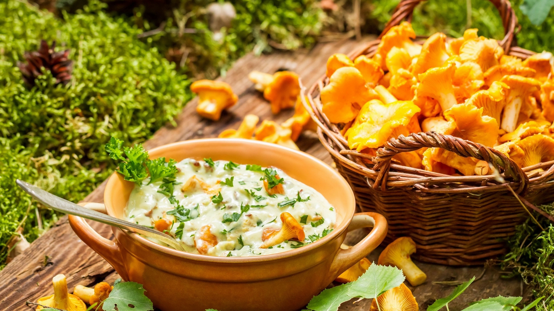 Description: A bowl of dip next to a basket of chips on a table in the woods with a spoon in it.