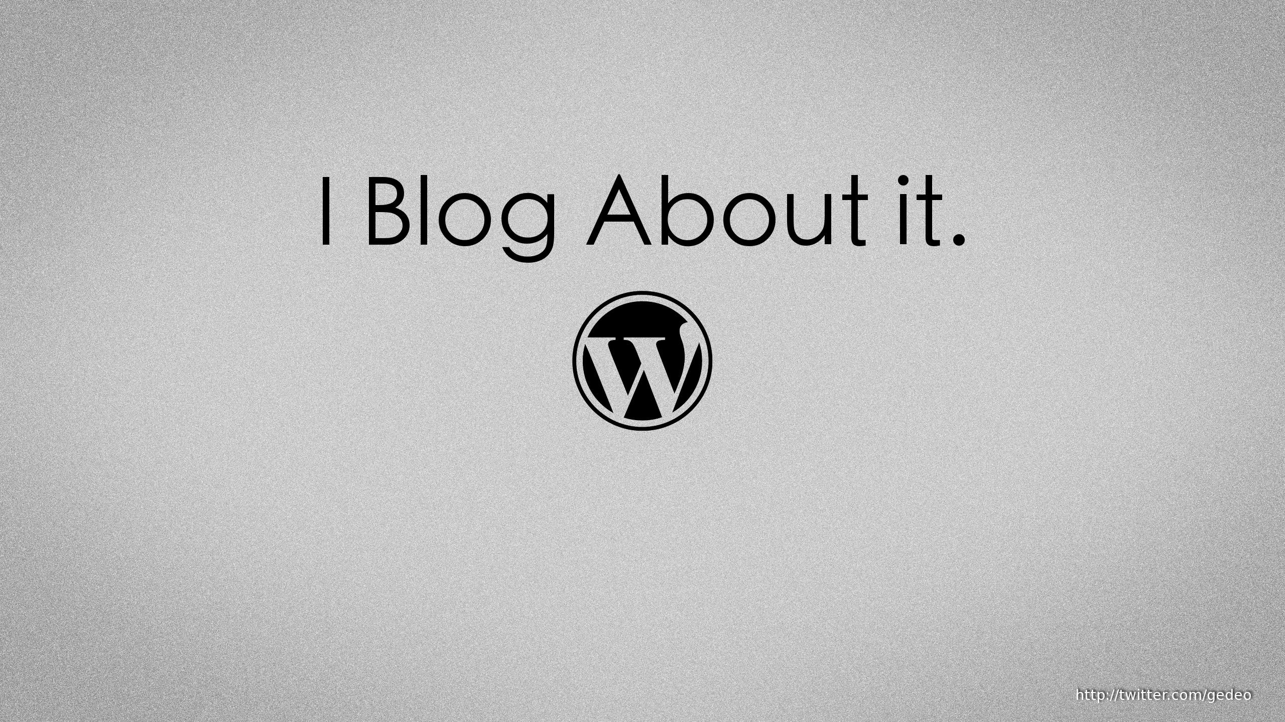 Description: A black and white photo of a wordpress logo with the word i blog about it written in it.