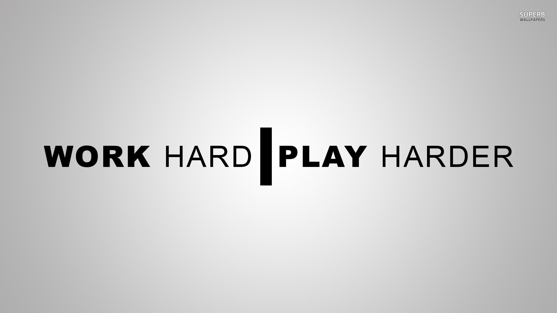 Description: A black and white photo of a logo for work hard play harder on a gray background with the words work hard play harder.