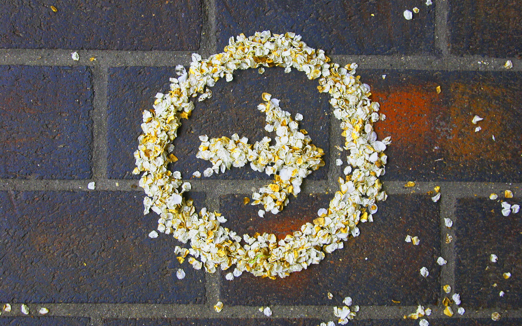 Description: A wreath made of flowers on a brick wall with a letter g in the middle of it and scattered flowers around it.