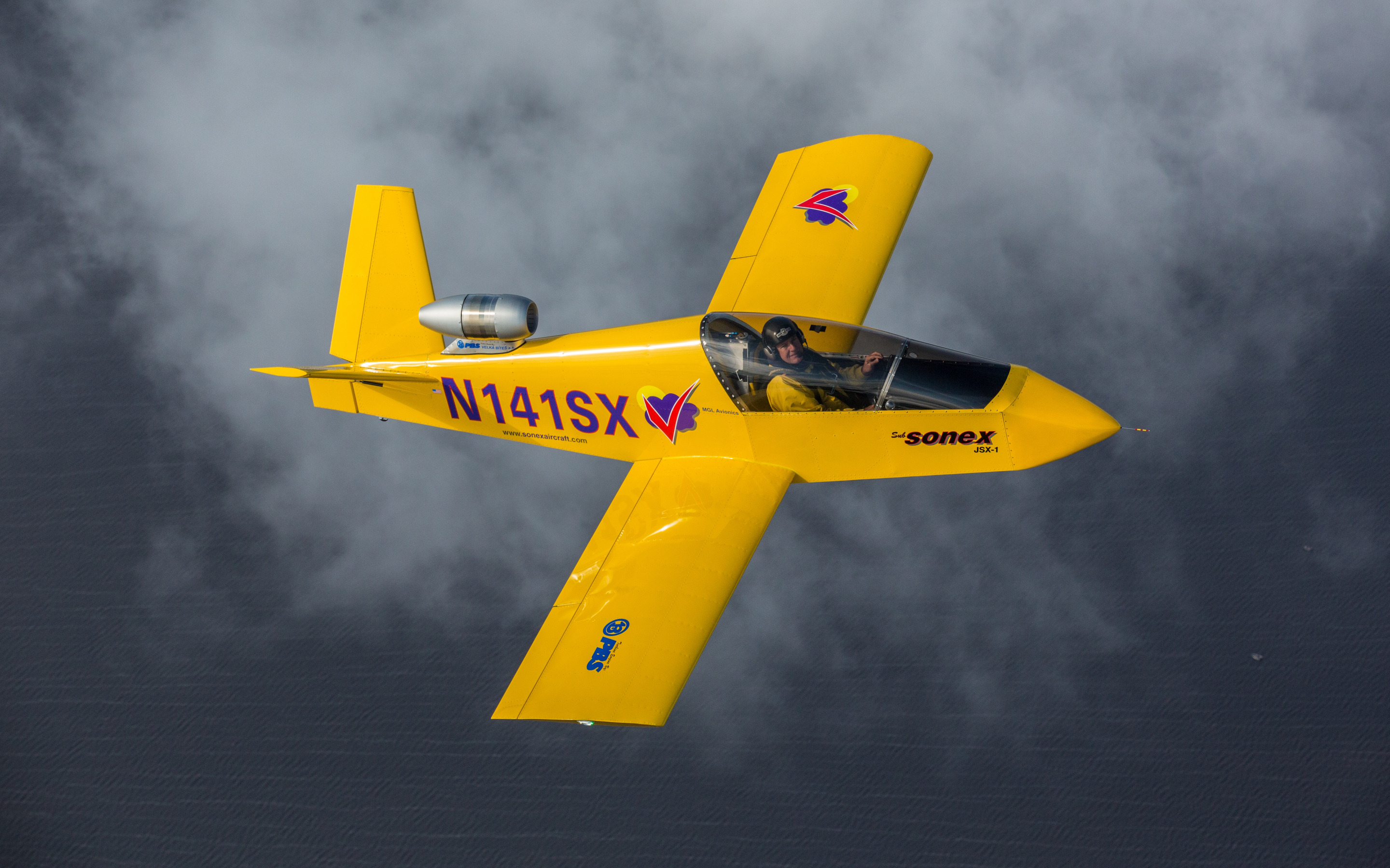 Description: A yellow airplane flying through a cloudy sky with a picture of a man inside the plane's cockpit.