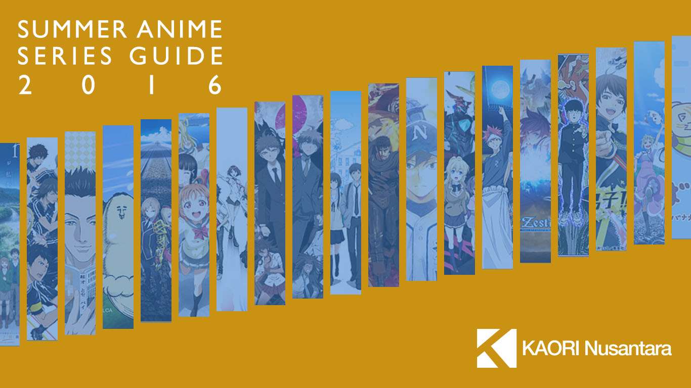 Description: A yellow background with a line of anime characters on it and the words summer anime series guide 2016 written below.