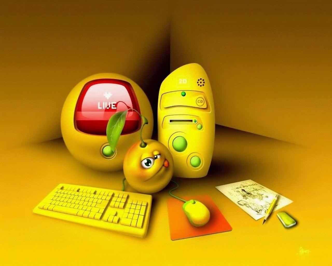 Description: A computer and a yellow apple sitting on a yellow surface with a yellow background and a yellow background with a yellow background.