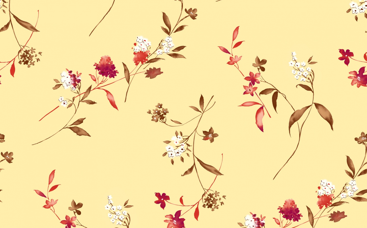 Description: A yellow background with a bunch of flowers on it and leaves on it.