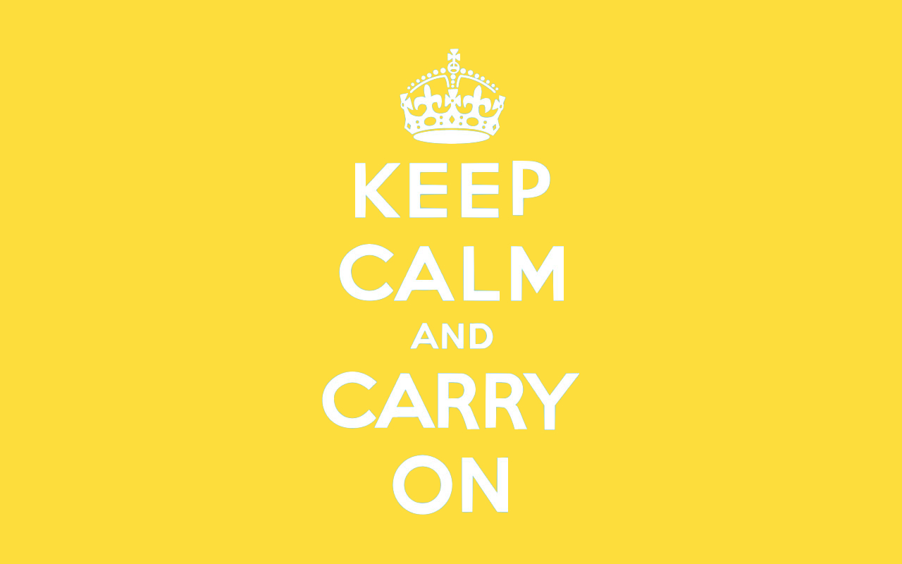 Description: A yellow background with a white text that says keep calm and carry on on on it.