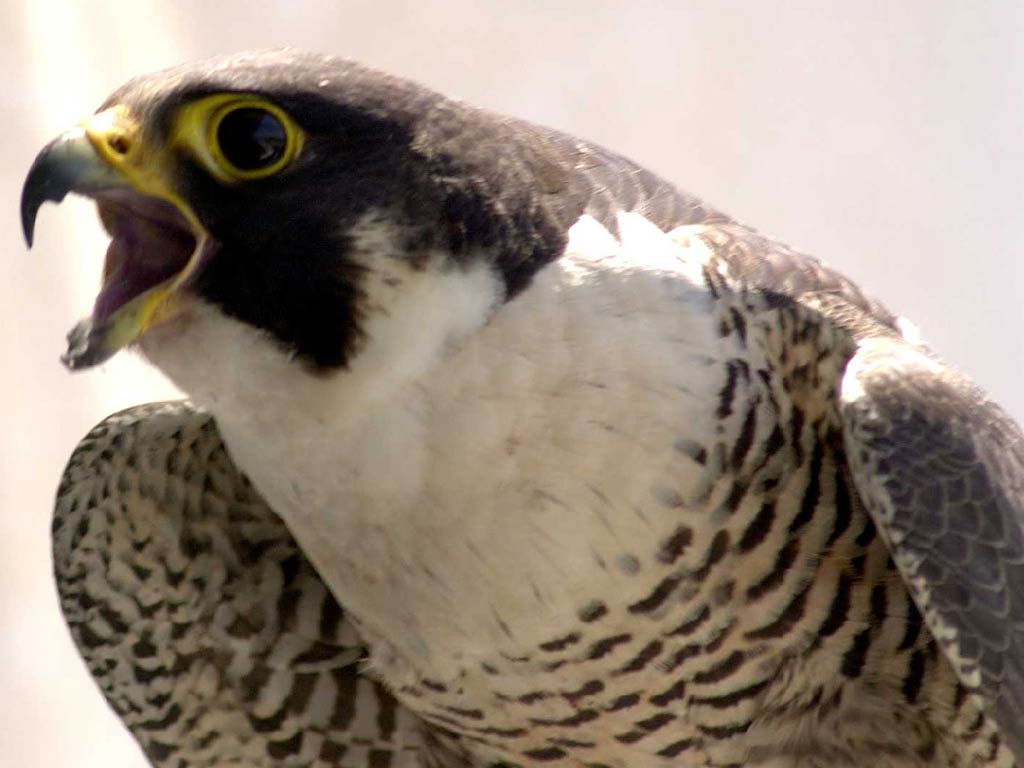 Description: A bird with a yellow beak and black and white feathers with a yellow beak and yellow eyes and a black and white body.