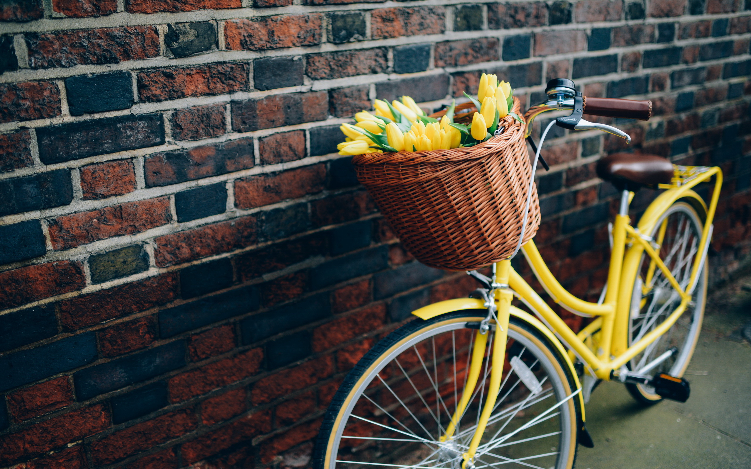 Description: A yellow bicycle with a basket of bananas on the front of it parked against a brick wall with a brick wall behind it.