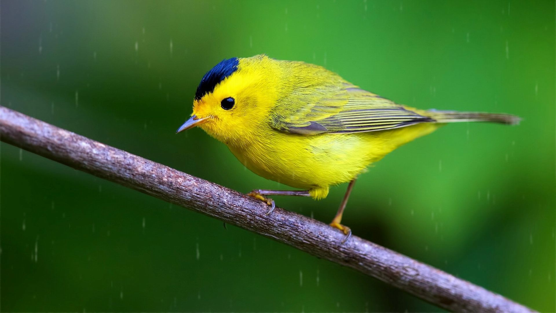 Description: A yellow bird with blue eyes sitting on a branch in the rain with a green background and a blurry background.