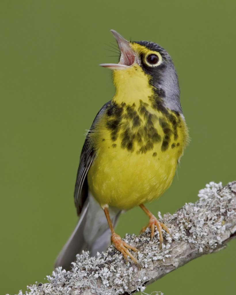Description: A yellow bird with a black and white beak and a green background with white flecks on it.