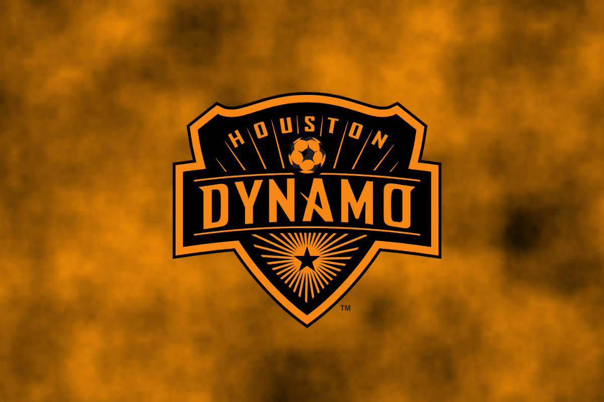 Description: A yellow and black background with a houston dynamic logo on it's side and a soccer ball in the center.