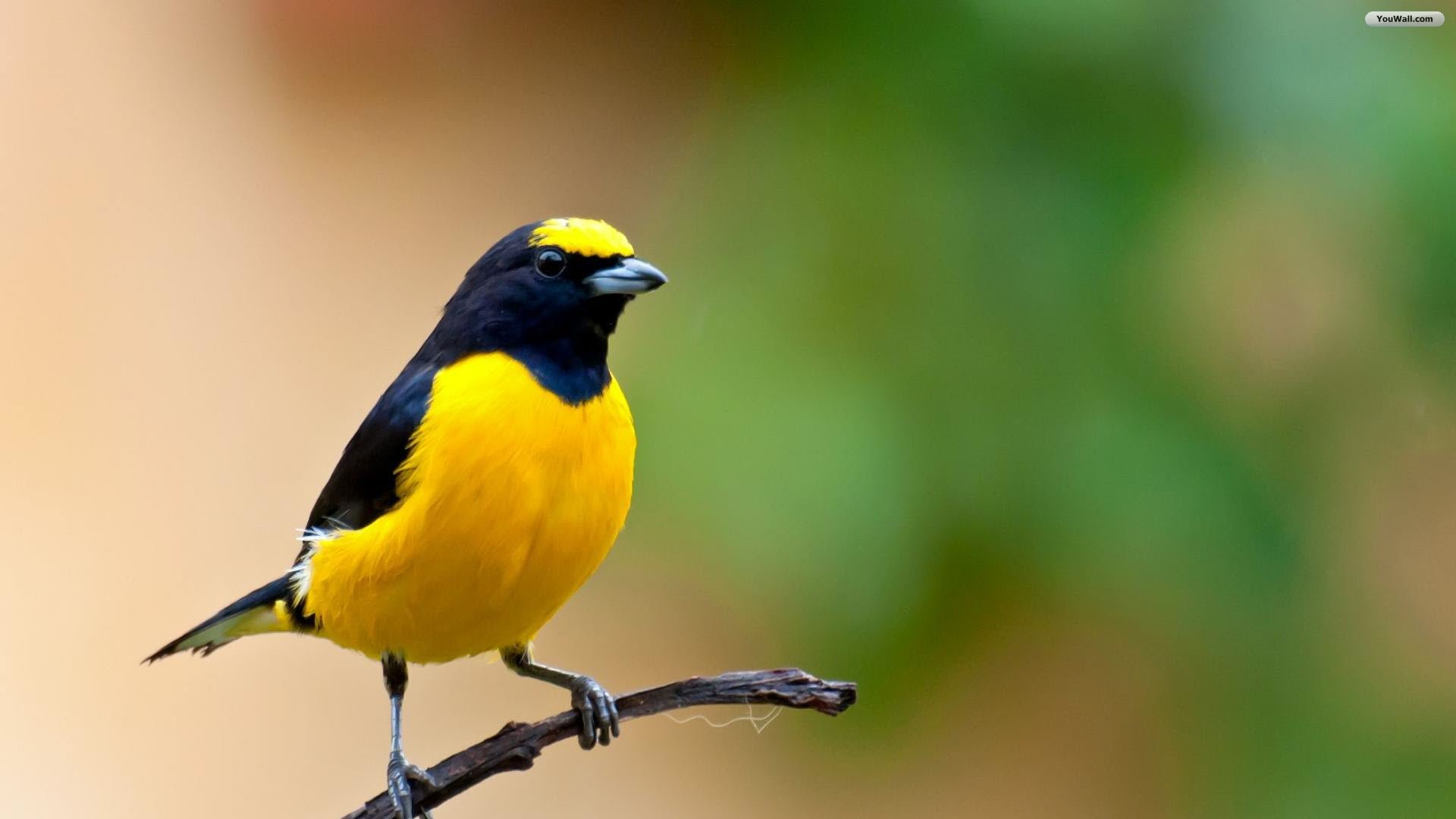 Description: A yellow and black bird sitting on a branch with blurry background of leaves and a blurry background.