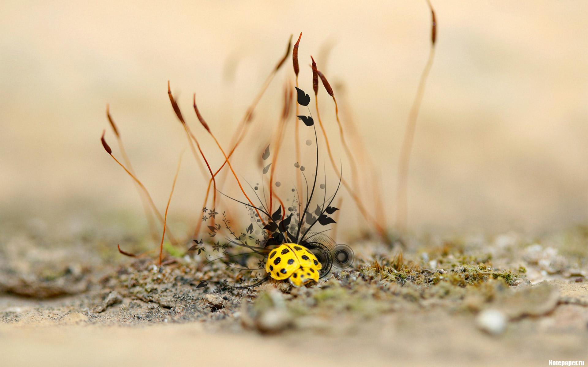 Description: A yellow and black bug sitting on top of a dirt field next to tall grass and dry grass blades.