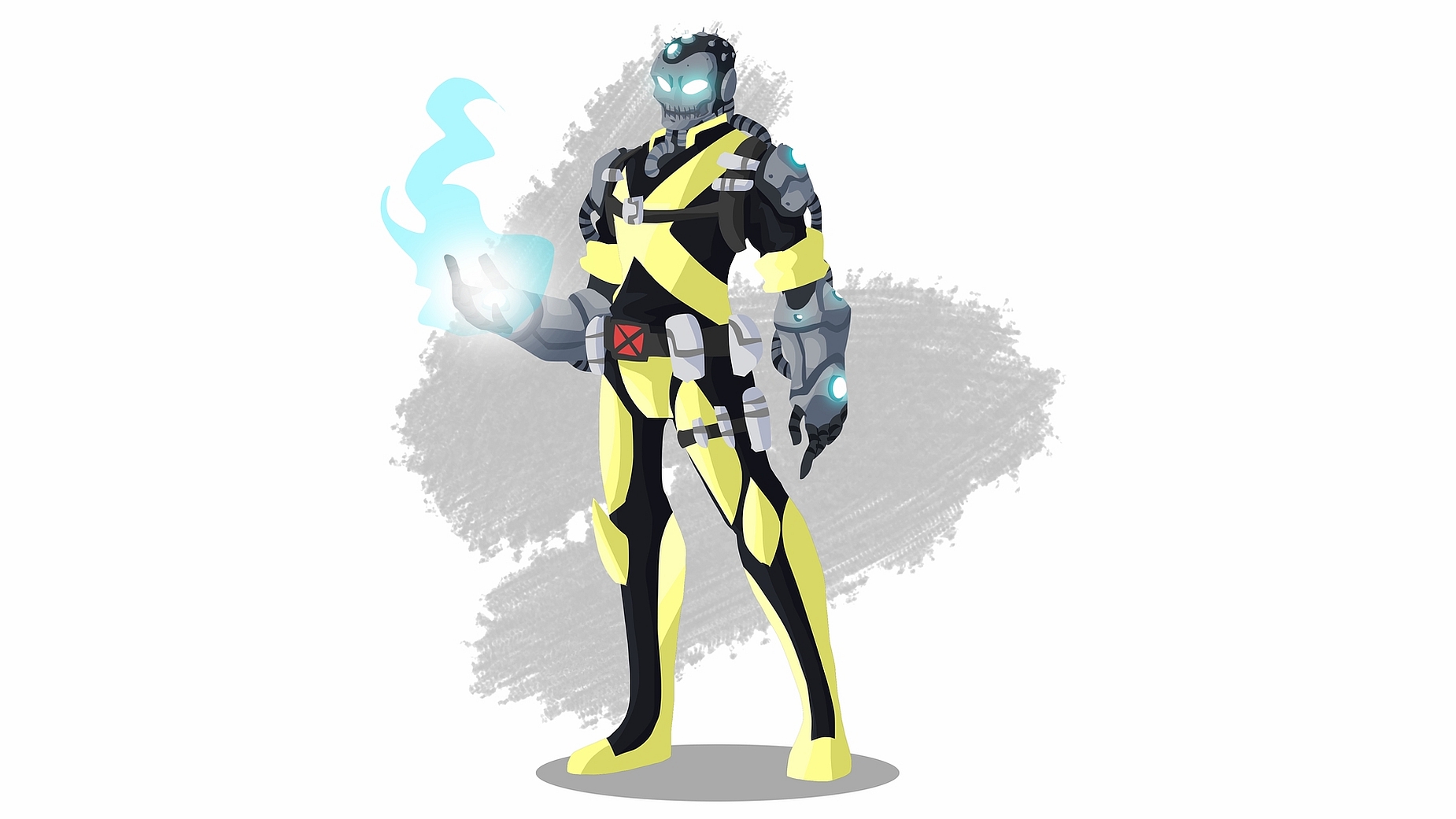 Description: A man in a yellow and black suit holding a blue ball of fire in his hand and a white background.