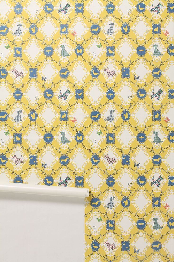 Description: A wall with a yellow and blue pattern on it and a white frame in front of it with a white wall hanging on the wall.