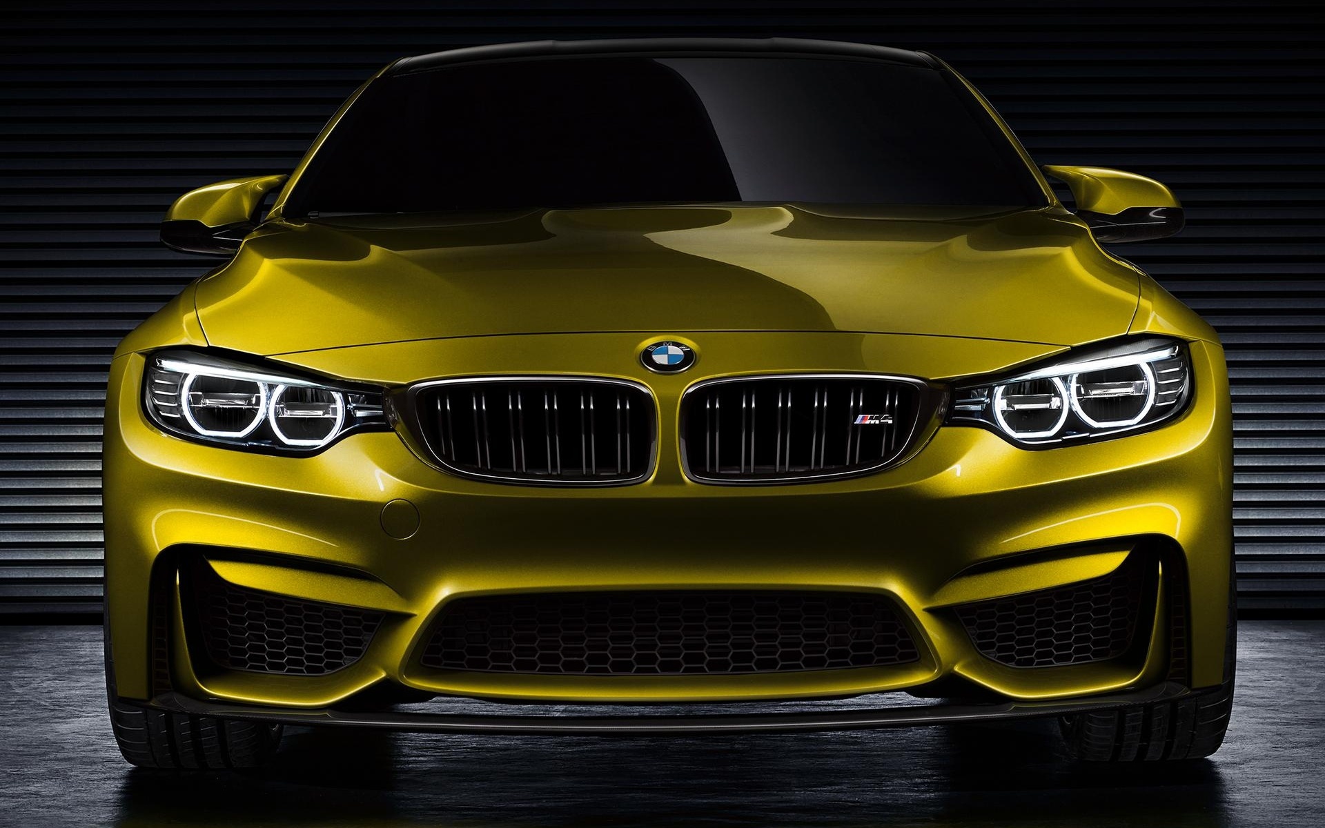 Description: A yellow bmw car is shown in a dark room with a black background and a black door behind it.