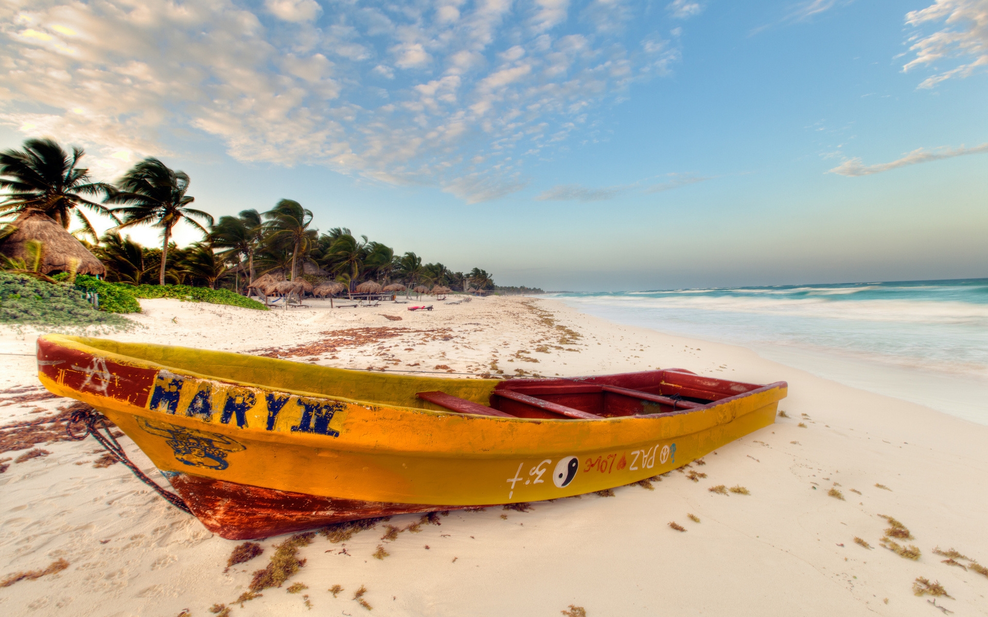 Description: A yellow boat sitting on top of a sandy beach next to the ocean and palm trees on the shore.