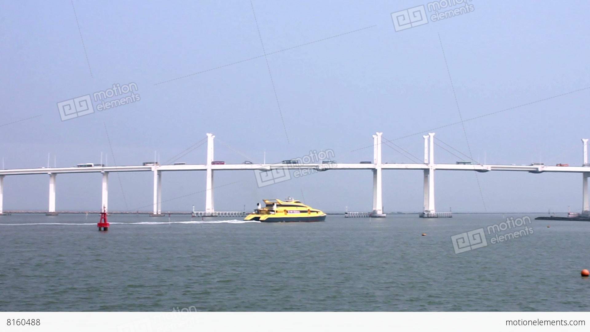 Description: A yellow boat is in the water near a bridge and a red buoy in the distance with a red buoy in the foreground.