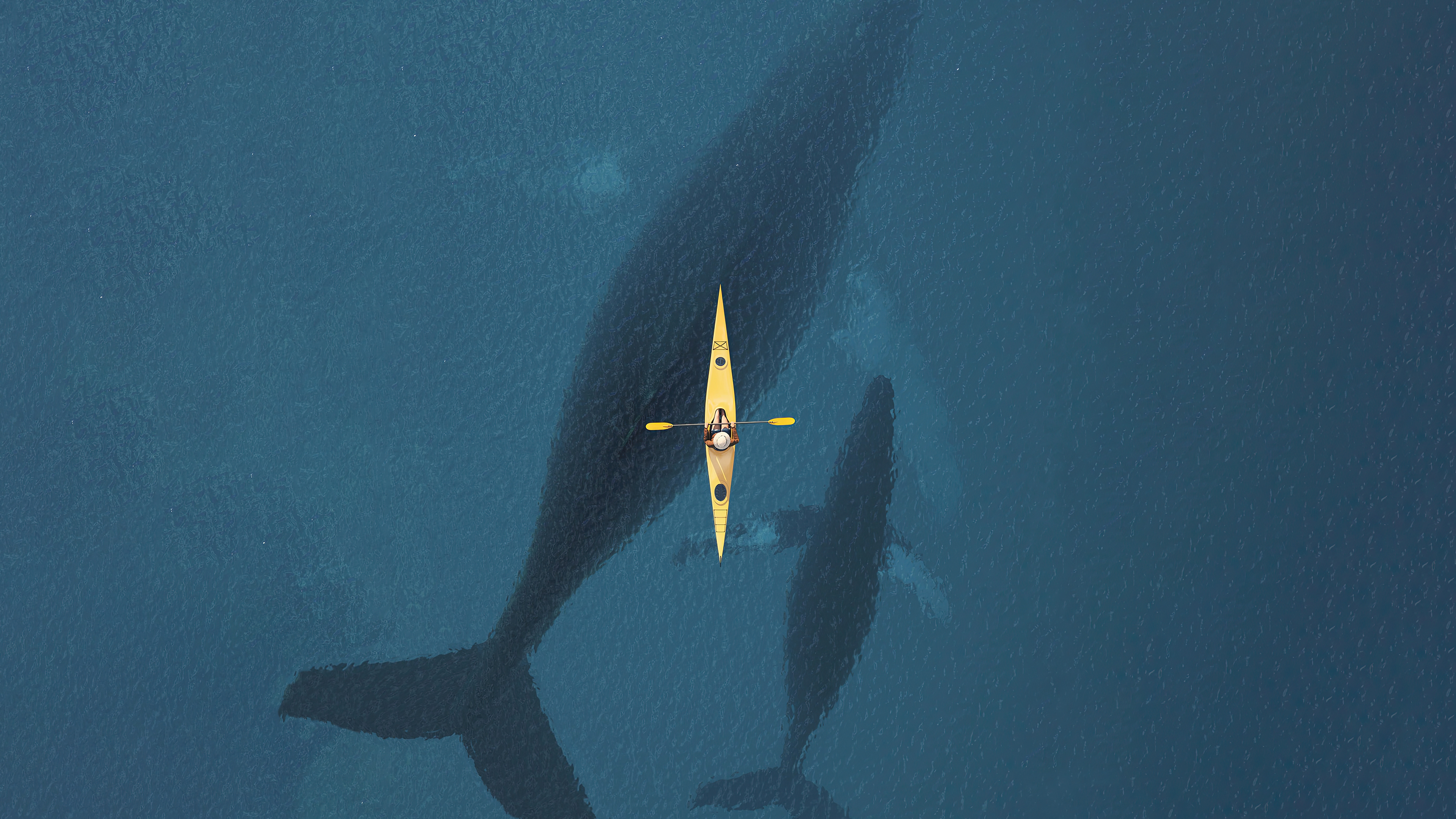 Description: A yellow boat is in the water with a large whale in the background and a yellow boat in the foreground.