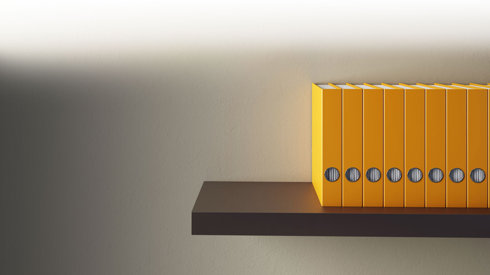 Description: A yellow book shelf with a row of books on it and a light on the wall behind it that is dim.