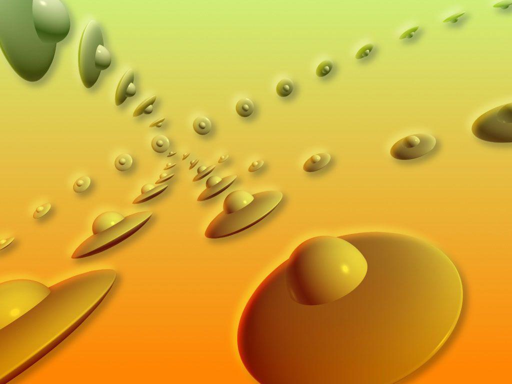 Description: A yellow background with many bubbles of water and a yellow circle with a green center and a yellow circle with a red center.