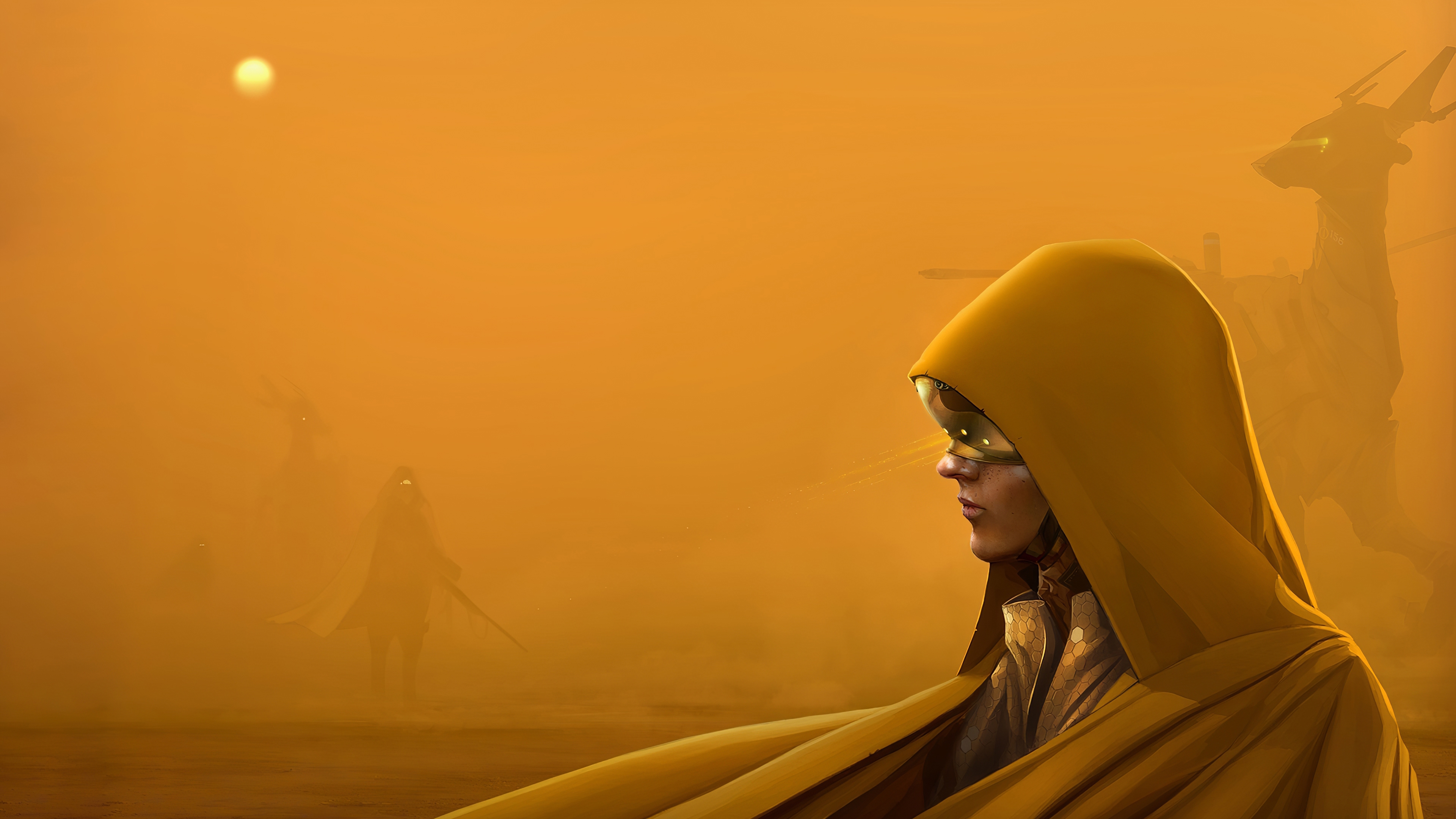 Description: A woman in a yellow cloak and a yellow background with a yellow sky and a yellow sun in the background.