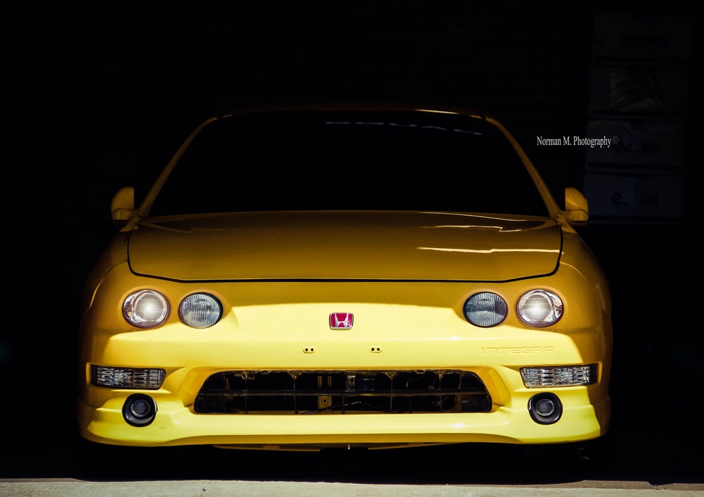 Description: A yellow car parked in a garage with its lights on and the front grill missing from the car's front bumper.