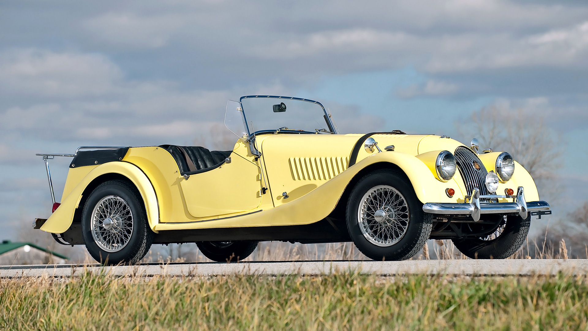 Description: A yellow car is parked on the side of the road in front of a building and a green car.