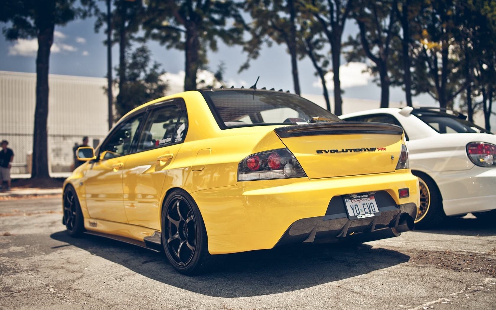 Description: A yellow car parked next to a white car in a parking lot with trees in the background and people standing around.