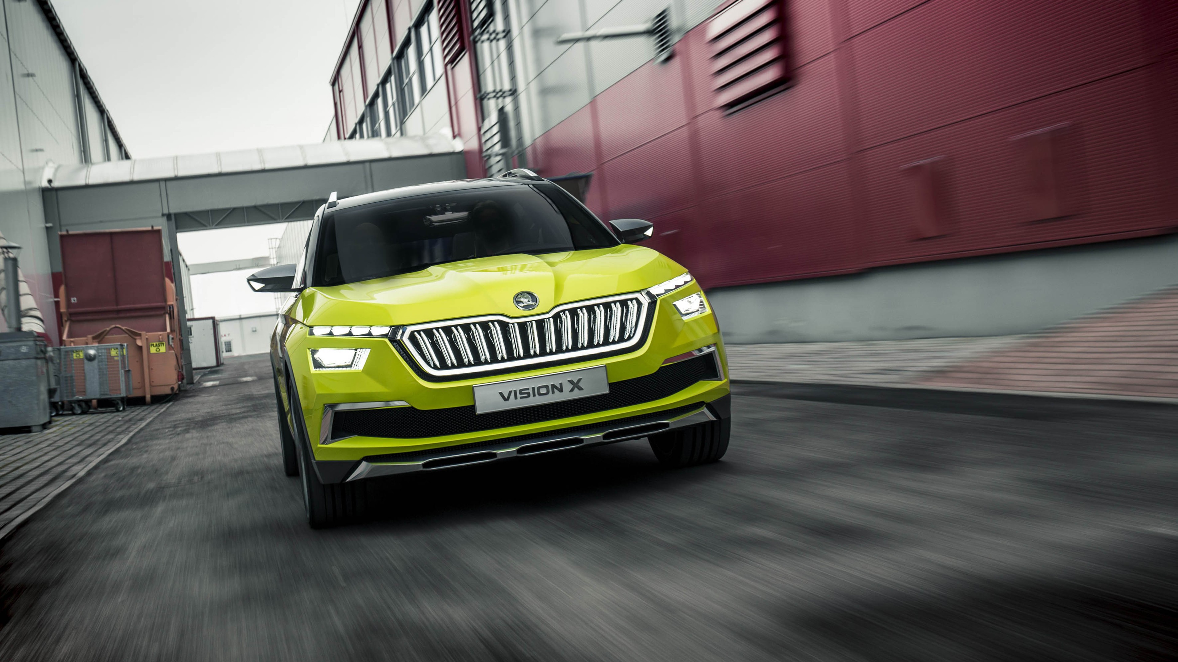 Description: A yellow car driving down a street next to a red building and a red wall with a red door.
