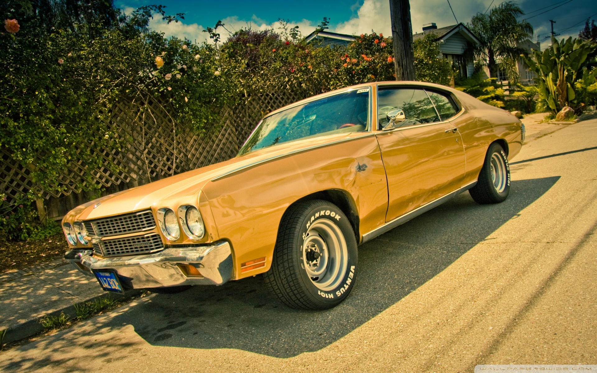 Description: A yellow car parked on the side of the road near a fence and bushes and trees in the background.