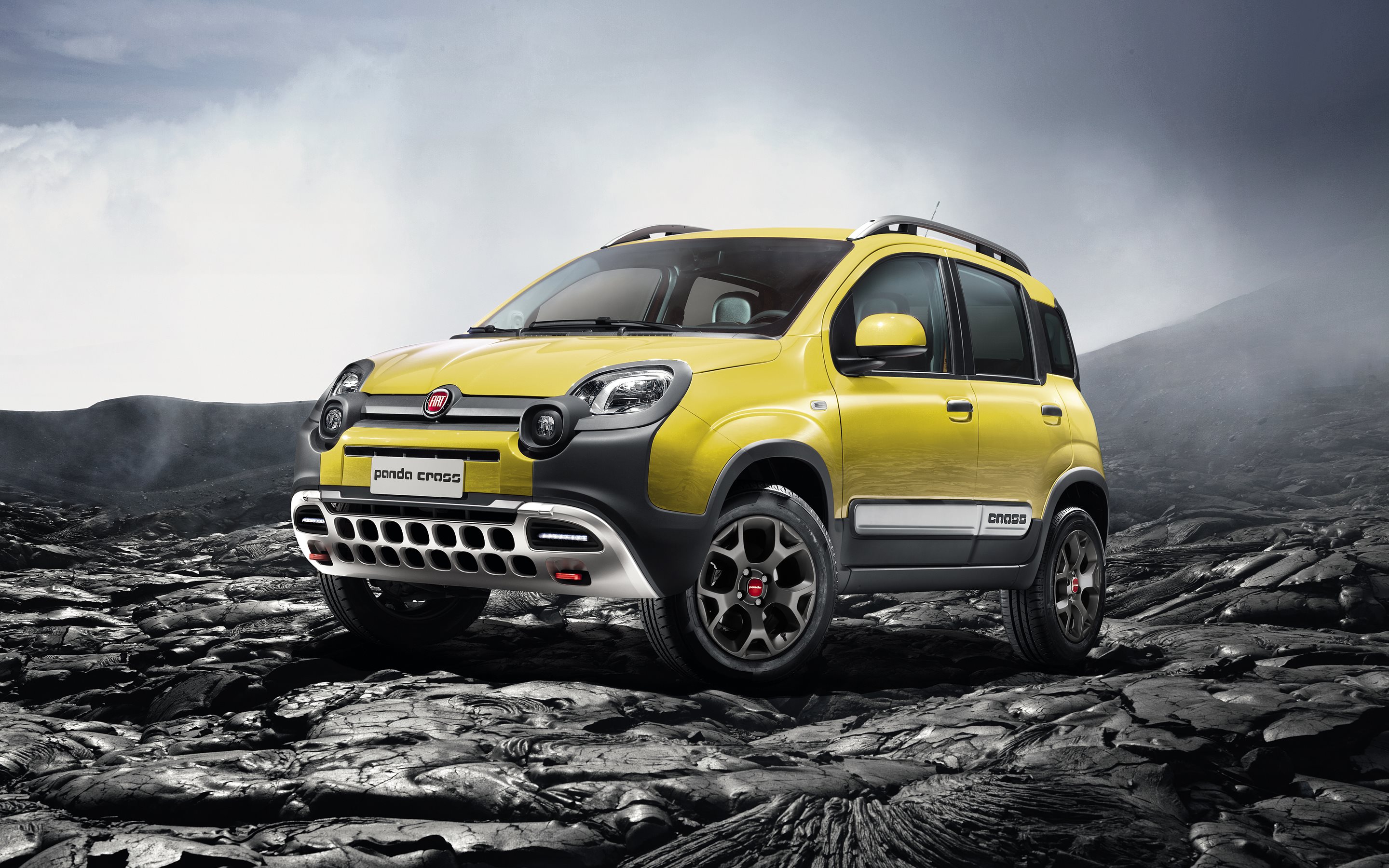 Description: A yellow car is parked on a rocky terrain with mountains in the background and clouds in the sky above.