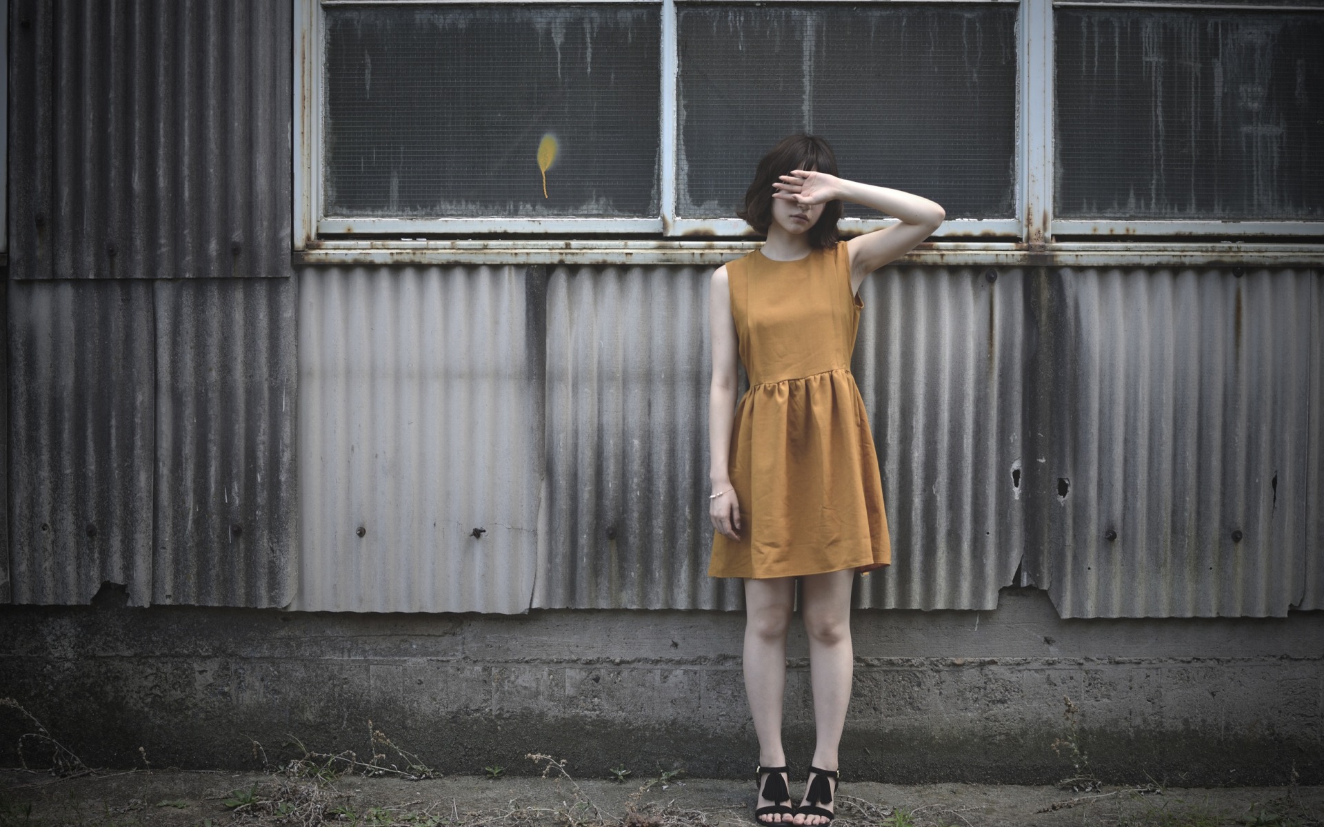 Description: A woman in a yellow dress standing in front of a window with her hands on her head and her hand on her head.