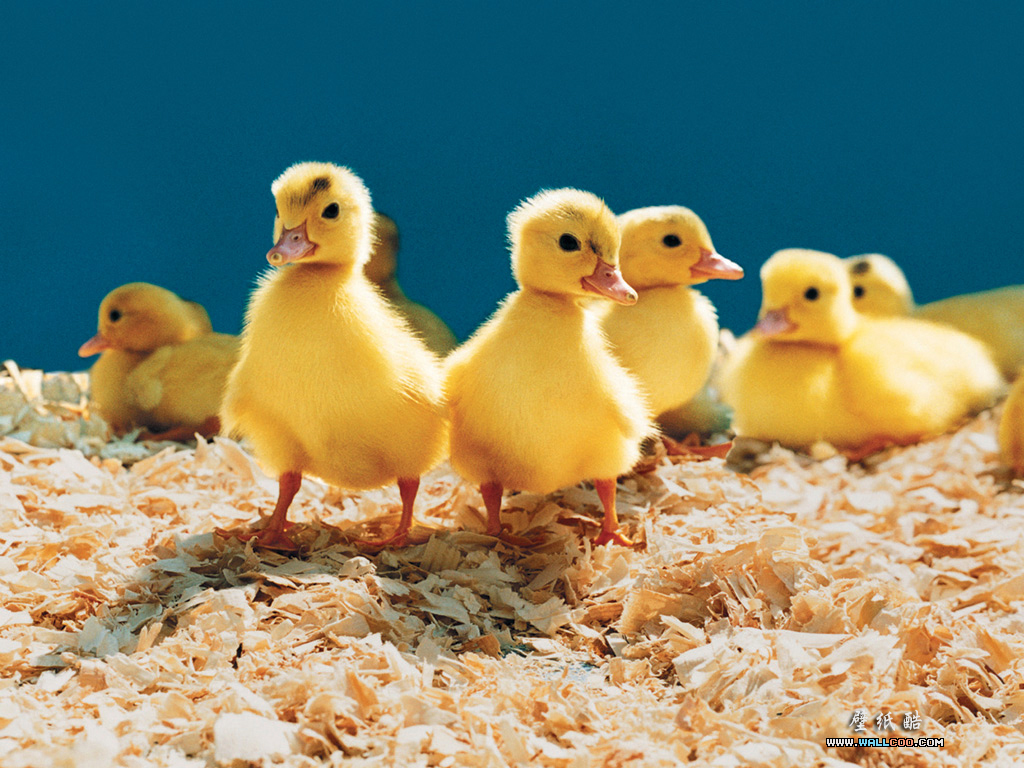 Description: A group of yellow ducks sitting on top of a pile of wood shavings on a blue background.