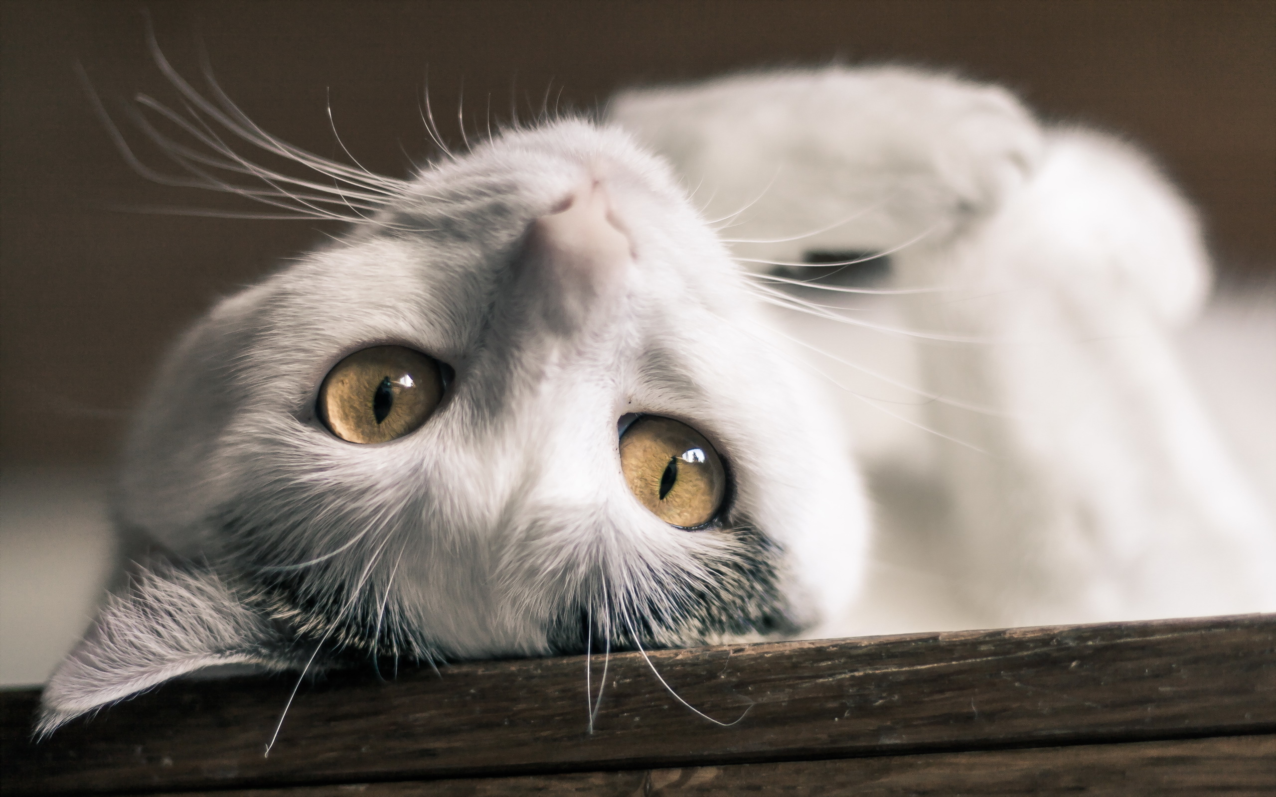 Description: A cat with yellow eyes looking over a wooden ledge with its head on the edge of a wooden box.