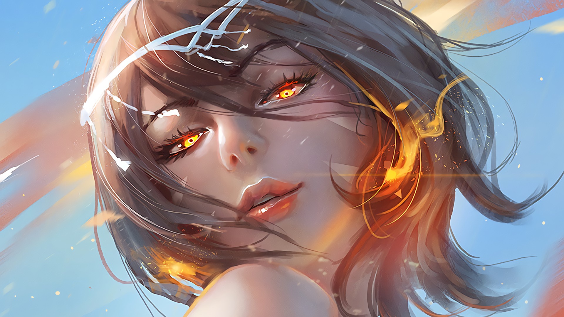 Description: A woman with yellow eyes and a black hair with orange eyes and a blue sky background with stars and clouds.
