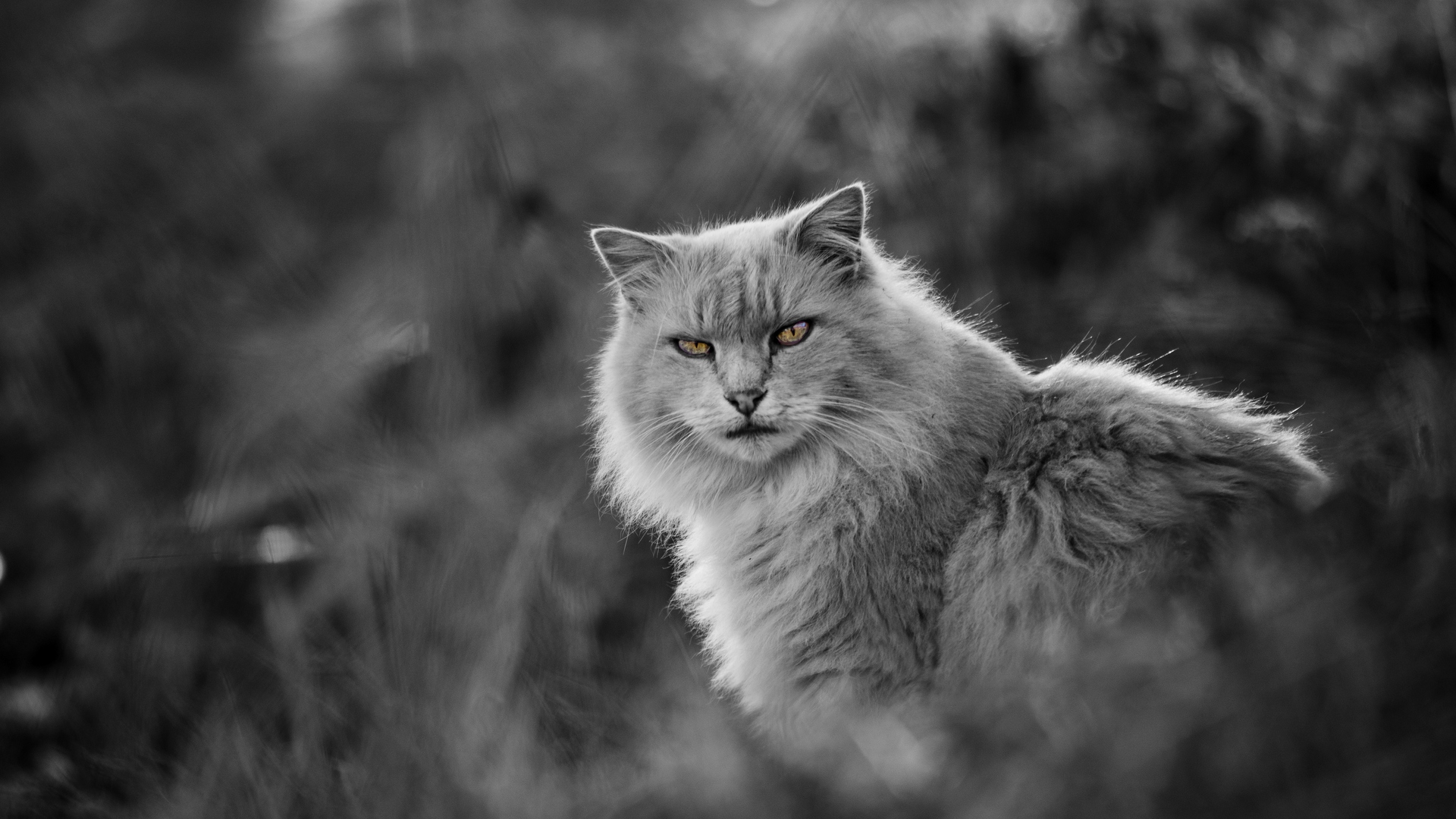 Description: A cat with yellow eyes looking at the camera in a black and white photo with a blurry background.