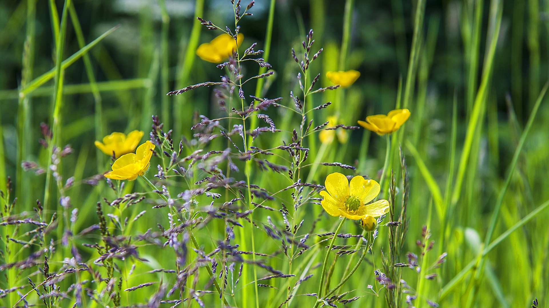 Description: A field of yellow flowers and green grass with a blue sky in the background and a few purple flowers.