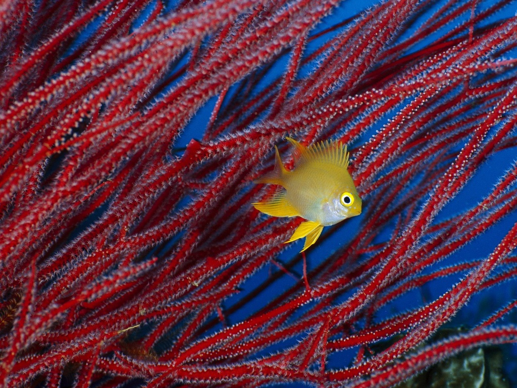 Description: A yellow fish swimming in a sea of red seaweeds in the ocean water with blue sky in the background.