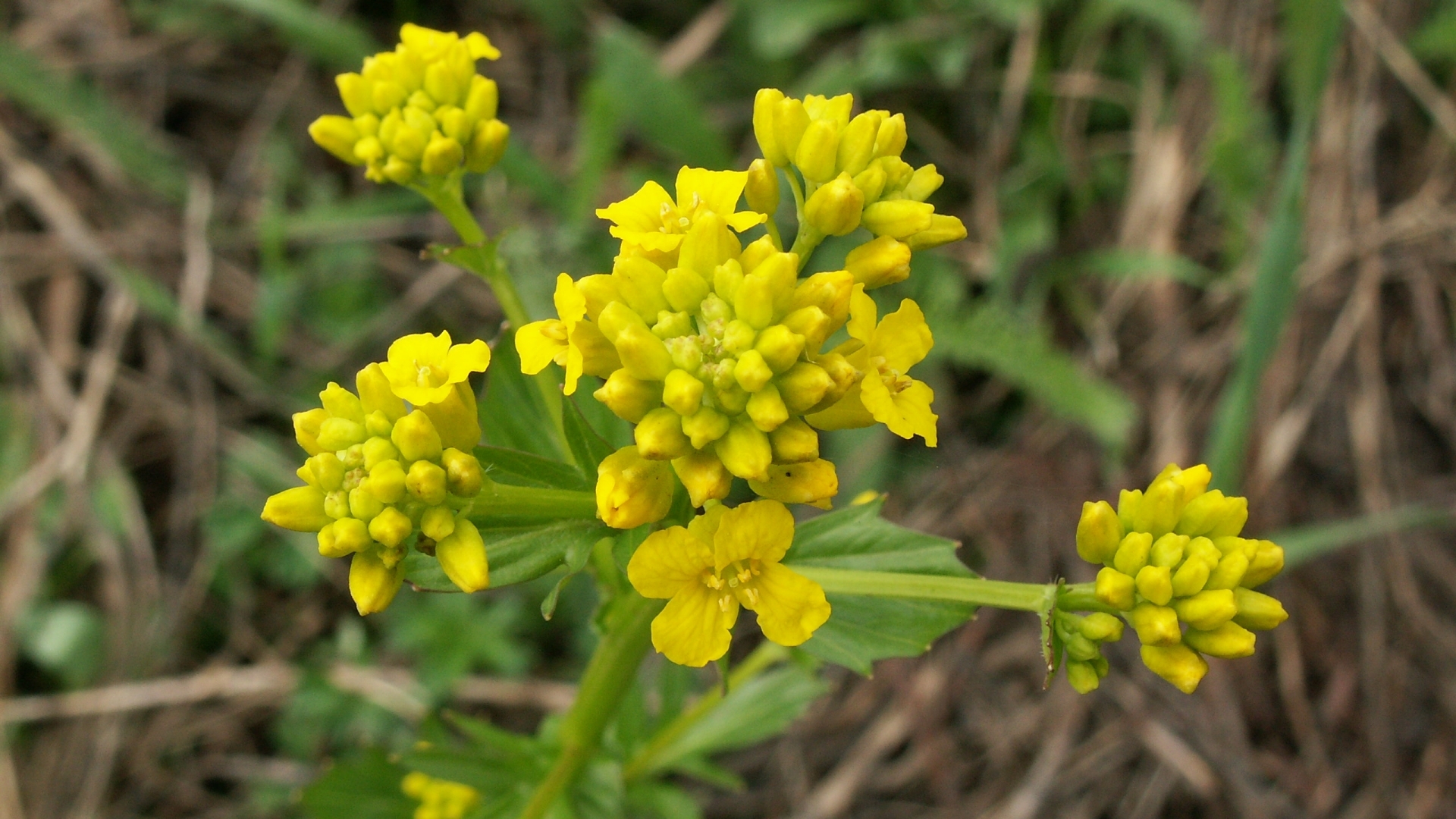 Description: A close up of a yellow flower with green leaves in the background and grass in the foreground.