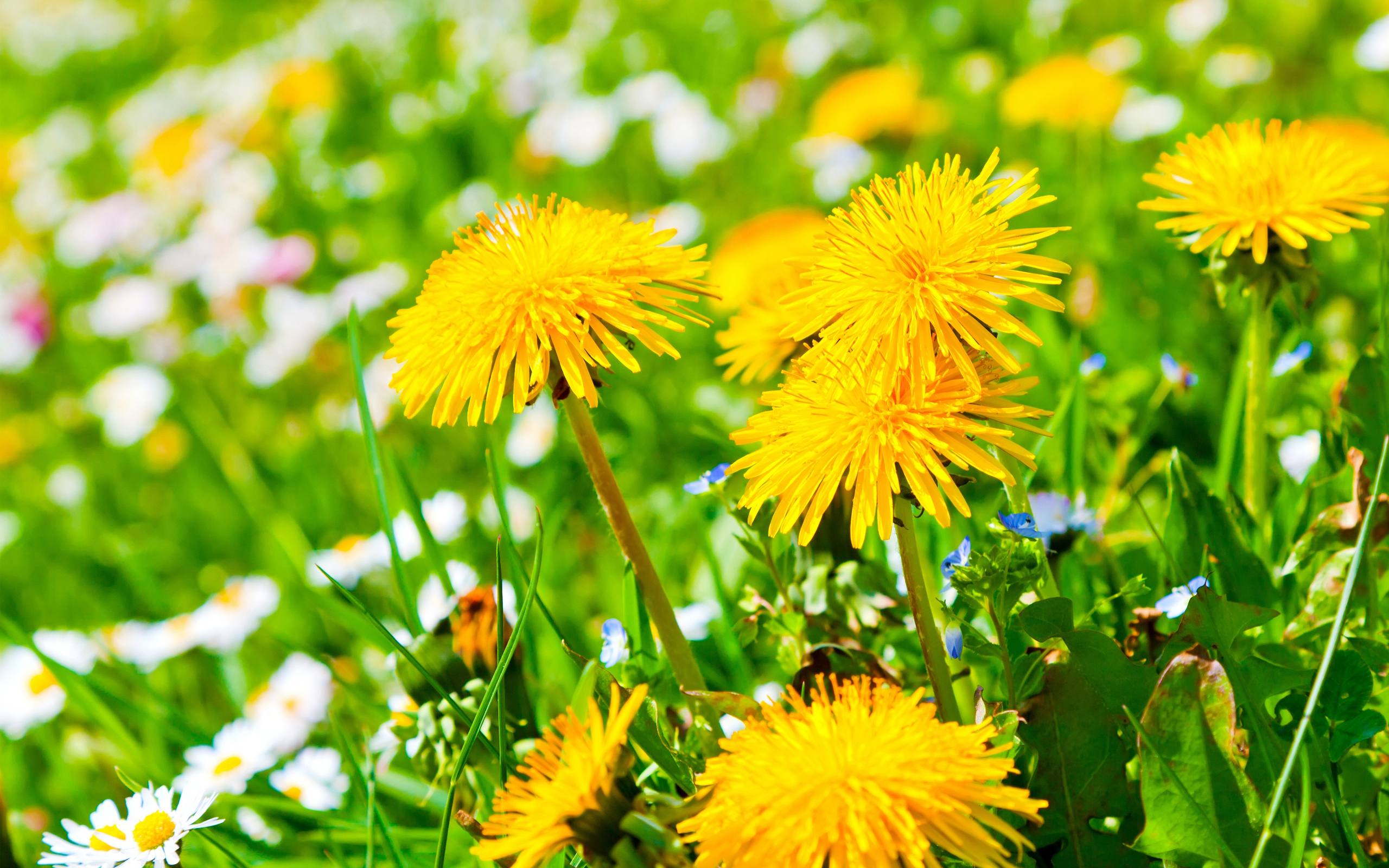 Description: A field of yellow flowers with white and blue flowers in the background and a green grass field with white and yellow flowers.