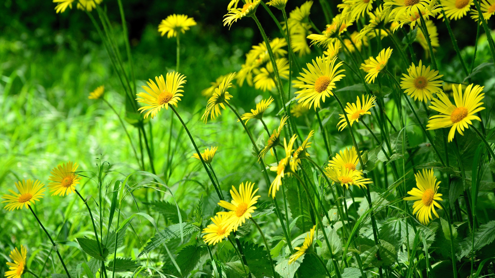 Description: A field of yellow flowers in the grass with a blurry background of green grass and trees in the background.