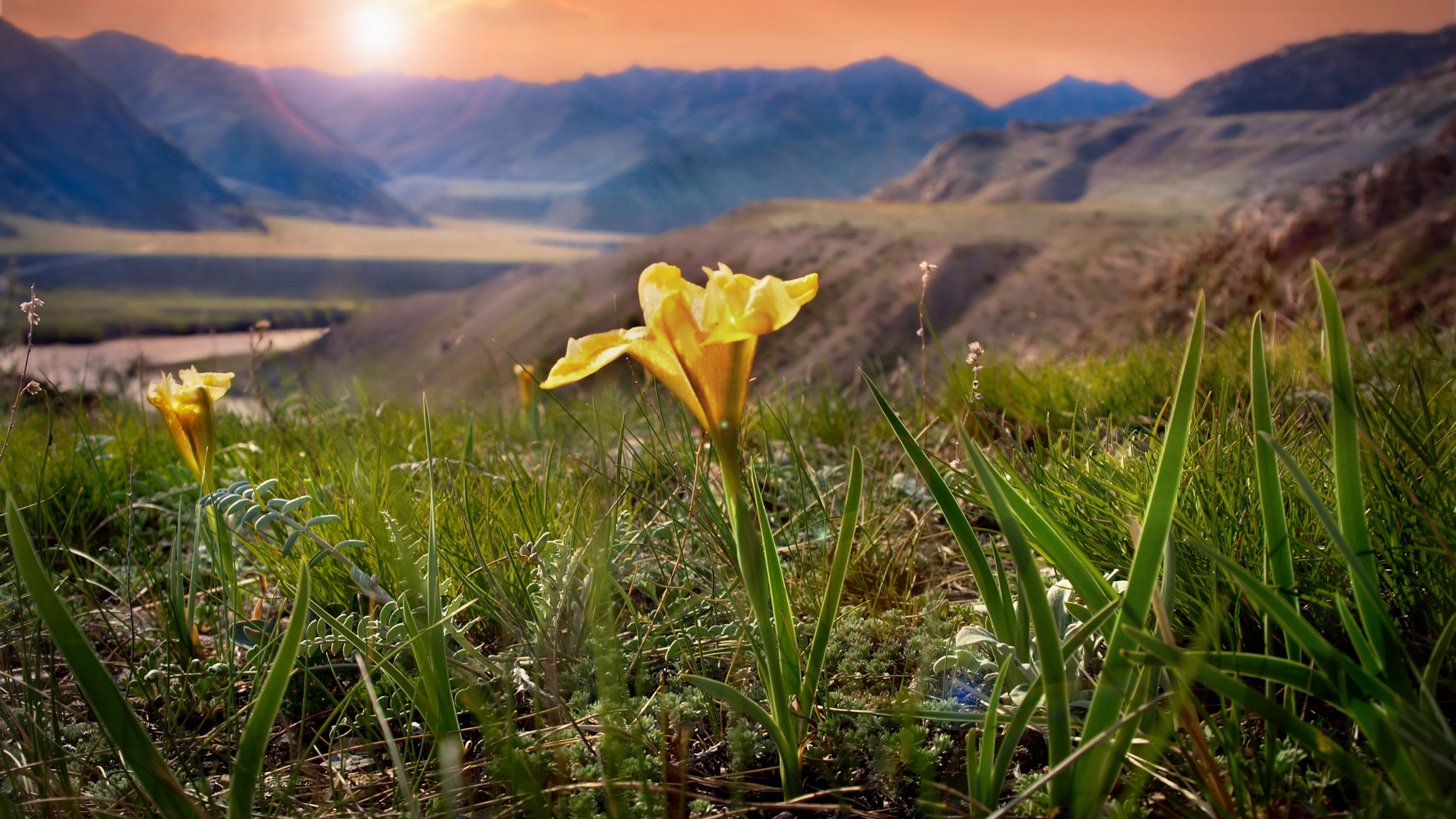 Description: A yellow flower is in the grass near mountains and a river in the distance with a sun setting in the distance.