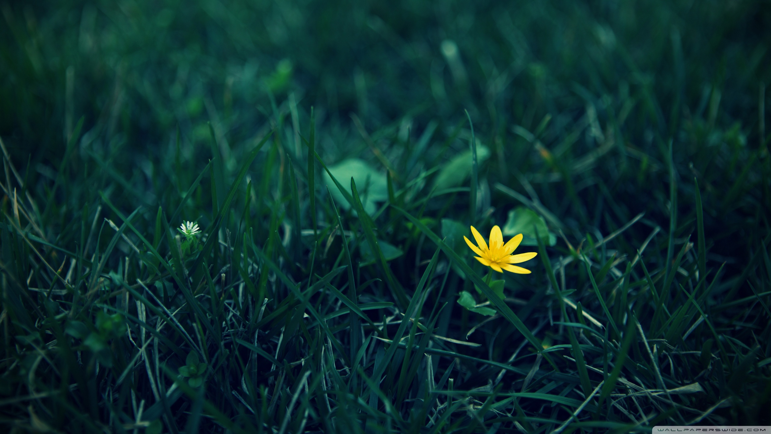 Description: A single yellow flower sitting in the grass on a sunny day in the park.